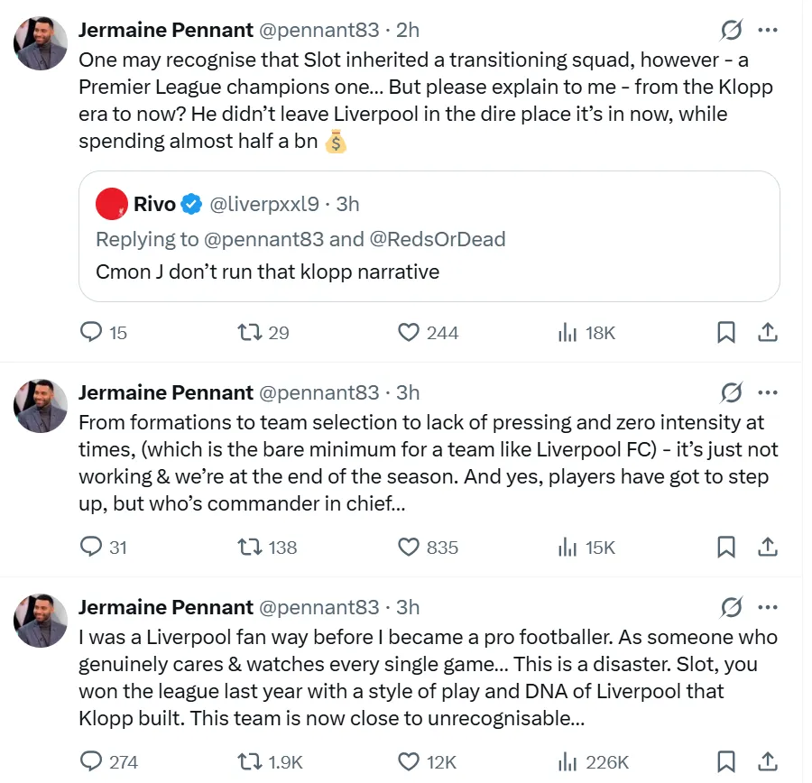 彭南特表示:“早在成为职业球员之前,我就是利物浦球迷。作为一名真心热爱球队、每场比赛都看的人…… 这简直是一场灾难。斯洛特,你去年靠着克洛普打造的利物浦风格与球队基因拿下了联赛冠军。可现在这支利物浦,已经几乎认不出来了……”
